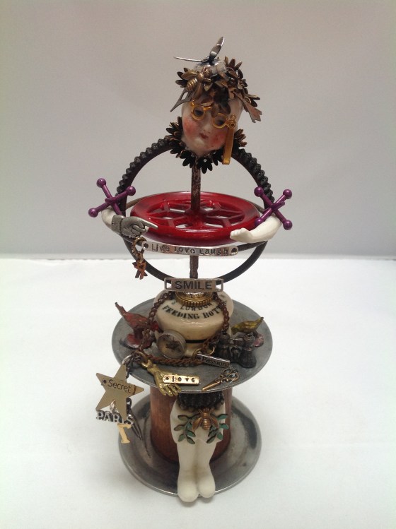 1. Smile for the Dolly: This art piece is made from a spinner mounted on a yarn spool, with a porcelain feeding cap antique doll head, arms and feet with lots of vintage charms, jacks. It also includes compasses, metal words, and two chickens.