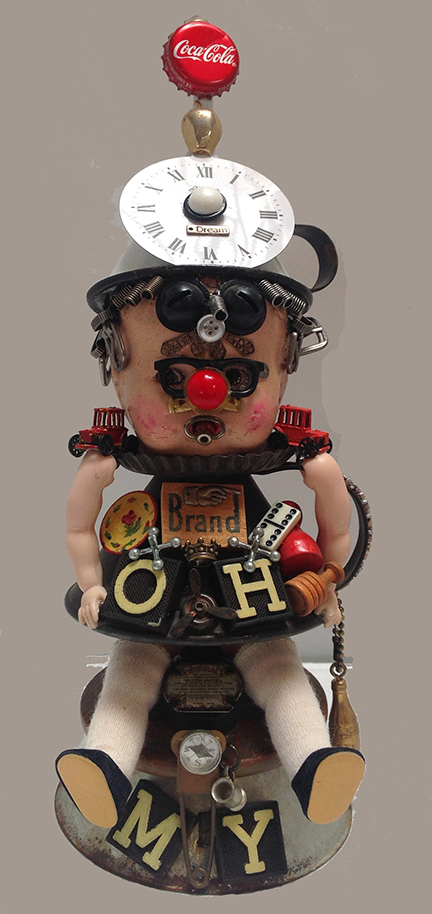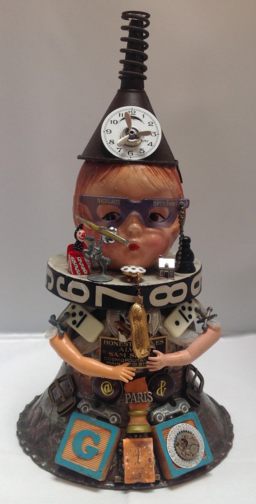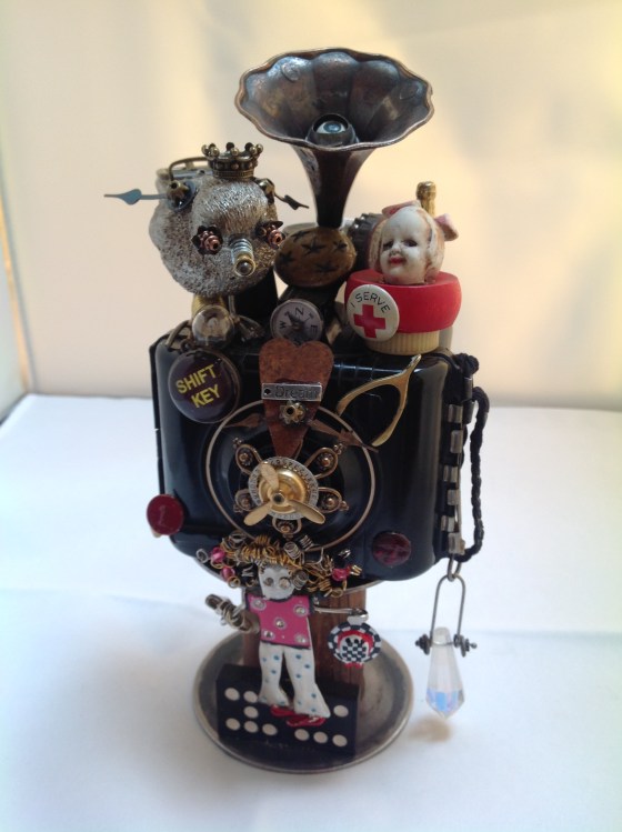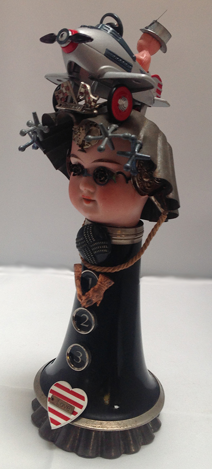 This art piece is made with an antique cookie tin attached to a vintage phone horn. Antique doll head is attached to a tart mold. Typewriter keys decorate the body with a heart button, jacks decorate the hat, headphones are made from a piece of misc electronics, watch mechanism decorates the forehead of the doll. A mini toy airplane is mounted on the hat with a baby sitting in the plane wearing a Monopoly top hat with a watch hand.