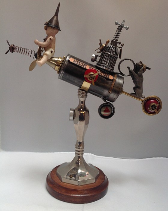 This art piece is made from a cake decorator mounted on a candlestick on a wooden base, is decorated with a mini pool ball, compasses, a hand made propeller with a spring and spinner attached, Bass Beer bottle cap charm, vintage baby doll wearing eye glasses and a perfume funnel hat, birdcage with propeller and spring with jack on top, dog wearing a beanie hat and spinner, metal and paper signs.