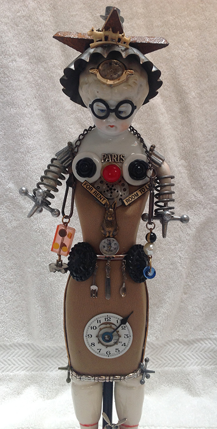 This art piece is made from a small dress form mounted on a wood block base with antique doll legs and head. The arms are also old and have springs around them. The doll head at bottom is vintage and is wearing a bucket hat with letter charm letters and spinner on top. Jacks decorate the dress and doll arms. Piece includes antique buttons, watch dial with watch parts, knife, spoon and fork pin, compass, rabbit, mini signs, chain with beads and domino chum, hanging by a chain. Metal pieces decorate the upper body. Doll is wearing a hat made from a mini cookie tin, a mini earthquake star, and a mini light bulb with a Monopoly game hat.