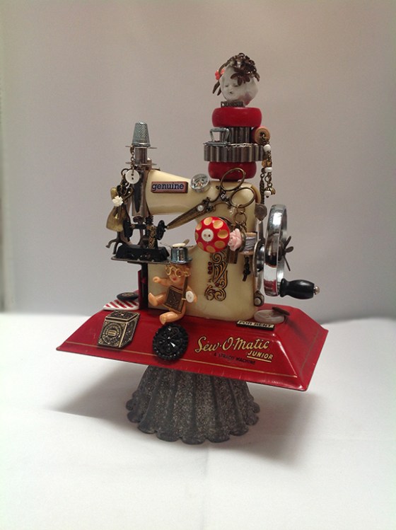 This art piece is made with a Sew-O-Magic Junior sewing machine, mounted on a fluted cup style metal container, lots of new and vintage buttons, sewing item charms, mini sewing machine, scissor charms, vintage baby doll, signs, Monopoly game pieces, bobbins, thimbles, vintage doll head, tape measure and dress form charms, compass, thread spool charm, metal gears and red wooden game pieces.