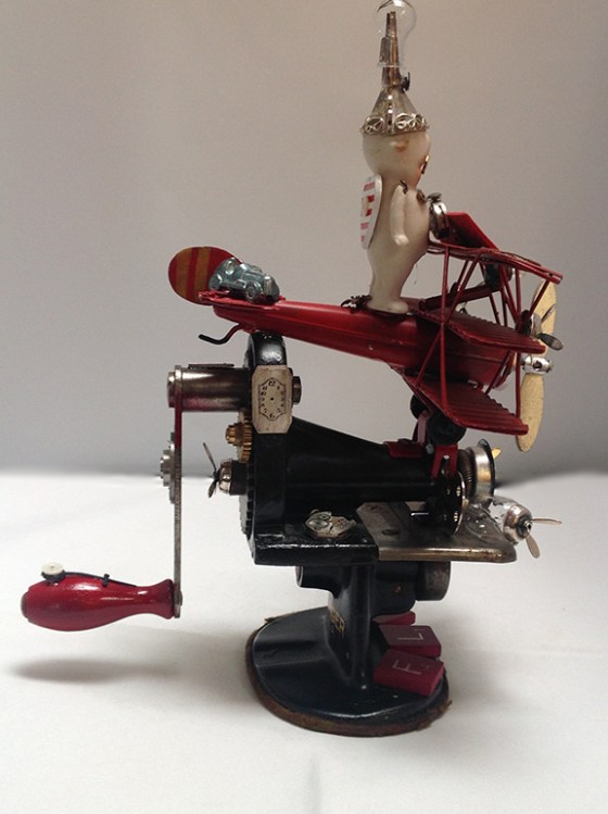 This art piece is made with a hand cranked mini hemming machine, a triple winged toy airplane sits on the machine, and is decorated with light bulbs, compasses, spinners, machine parts, watch calendar rings, watch movement, mini light bulb, mini cupid style doll, wearing a perfume funnel hat with a light bulb finial and watch hand, monopoly game pieces, watch movements and Scrabble game letters.