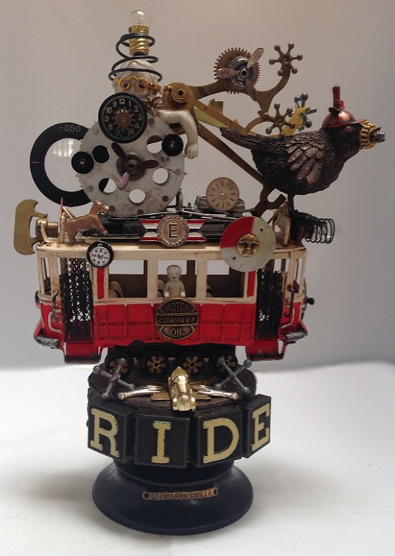This art piece is made from a toy trolley car sitting on a handmade wooden base with wood letters from an old game, Monopoly game pieces, jacks, hand charms, Motor Oil Company brass button, compass, Frozen Charlotte mini doll, watch movement pieces, antique doll head wearing spring and lightbulb hat, key wind handle, clock parts, bronze toned bird wearing beanie hat and e-flag pin.