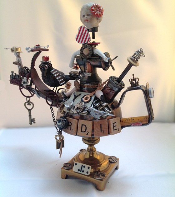 This art piece is made from a brass candlestick, with a brass handled oil can mounted on top, Scrabble game piece letters, mini dominos, antique doll head, Frozen Charlotte doll, Monopoly game pieces, mini silver bird cage, bronze finished bird, electronic and watch parts, mini glass bottle with pearls inside, mini metal scooter, watch hands, vintage buttons, crown, spinners, mini compass, springs, and wood yard stick piece.
